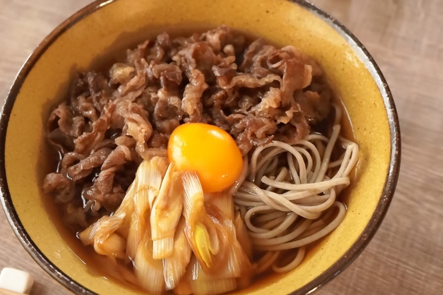 牛すき焼きと卵黄をそばにたっぷり絡めてお召し上がりください。