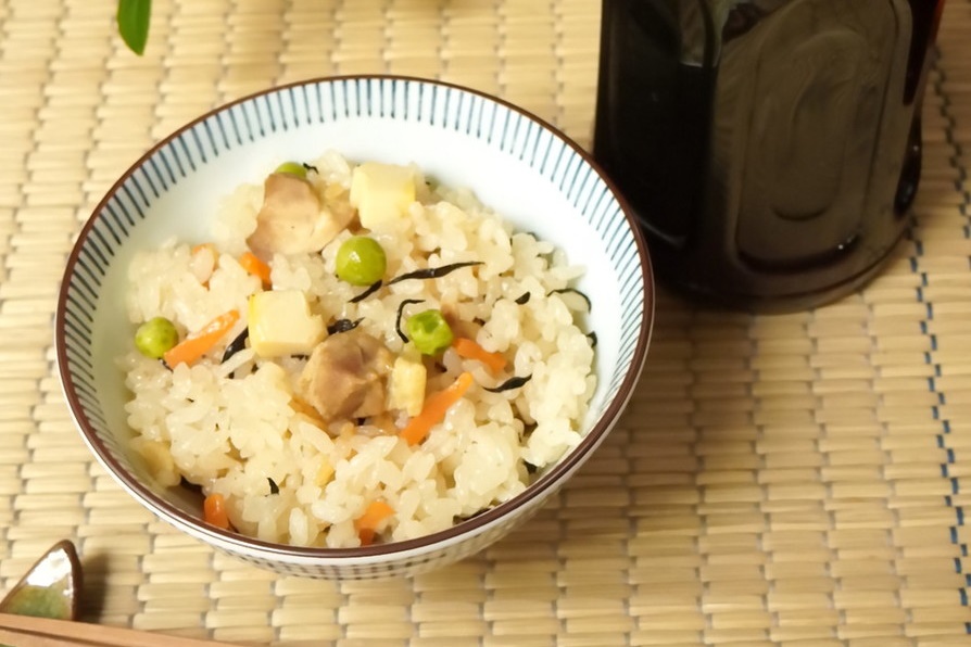 昆布つゆを使うと炊き上がったご飯色が濃くならず、具材の色と味を引き立てます。