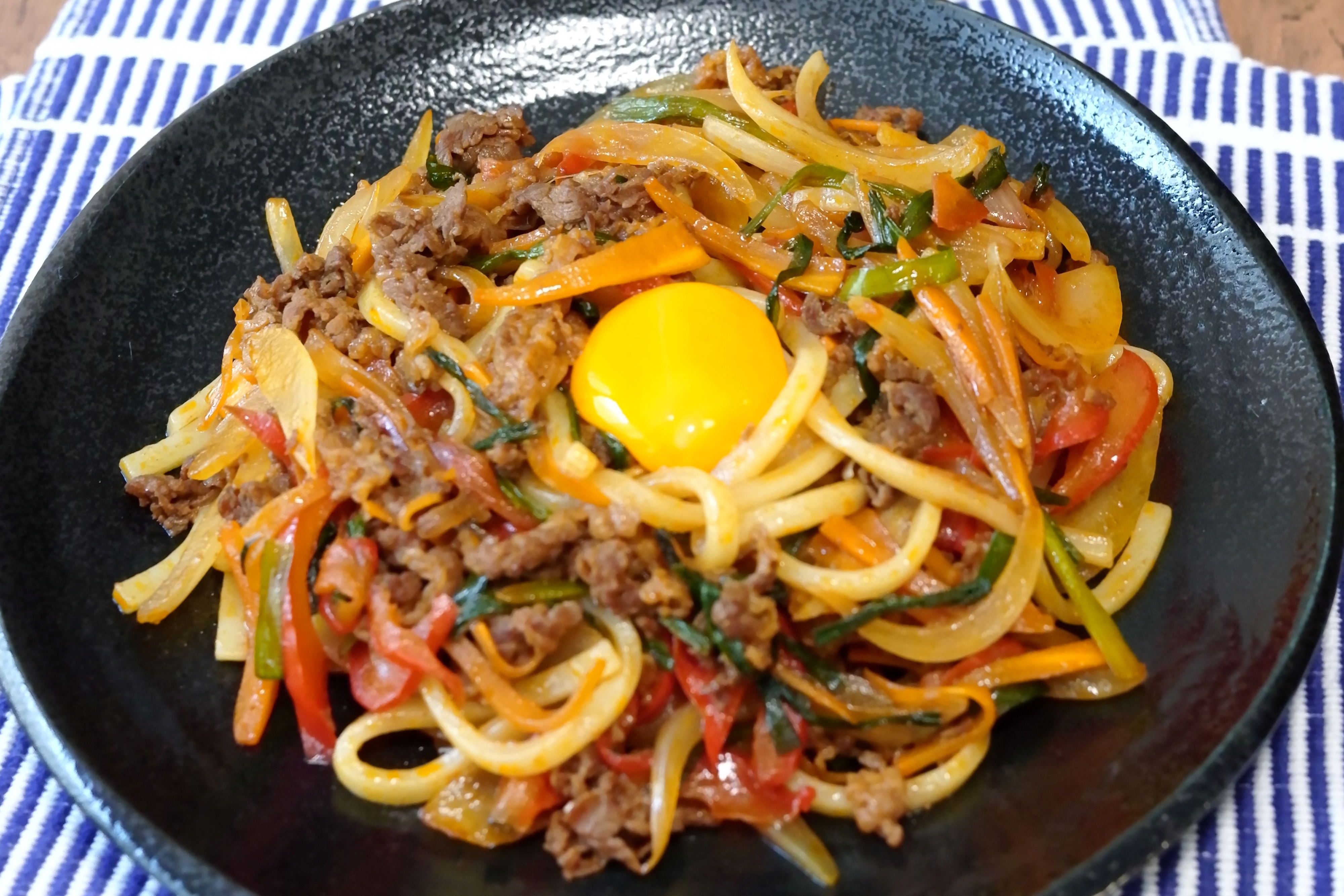 あまくち醤油を使った甘辛いタレで漬け込んだプルコギとうどんを一緒に炒めた韓国風の焼きうどんです。