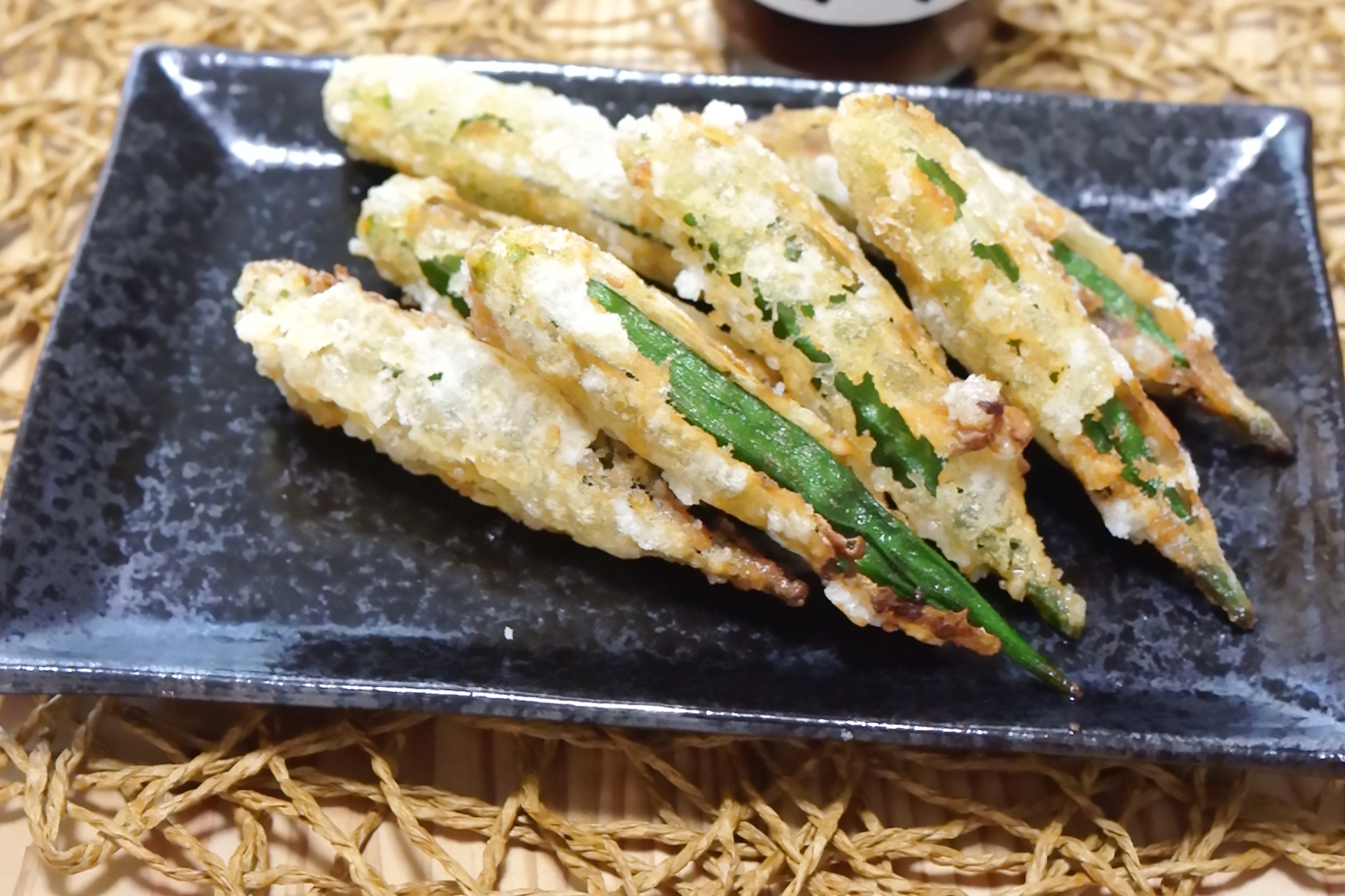 しょうが油に漬け込んだオクラをカラッと揚げました。