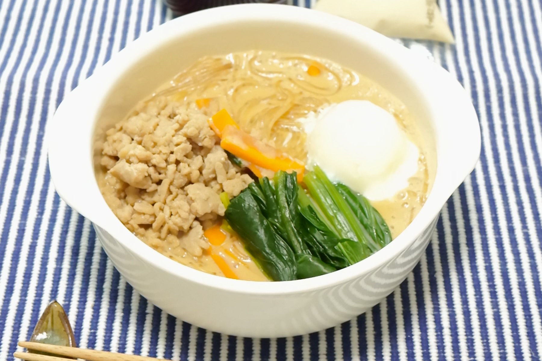 春雨のつるっとした食感に、鶏ひき肉の旨味と豆乳のまろやかさが溶けあったスープです。