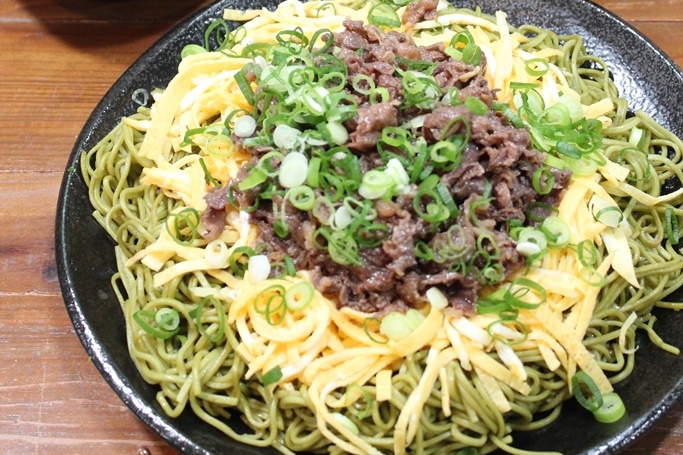 茶そばと具を温かいめんつゆにつけてお召し上がりください。