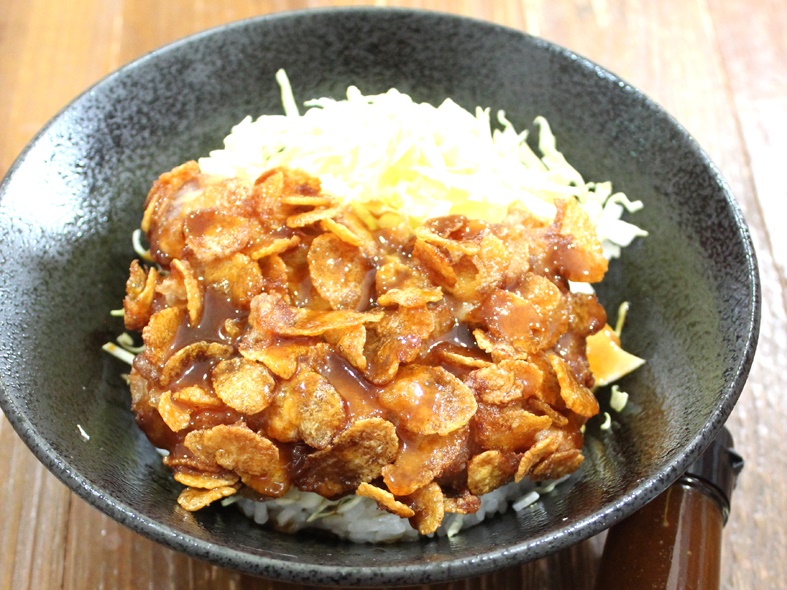ザクザクした食感のコーンフレーク豚カツにソースがよく絡みます。