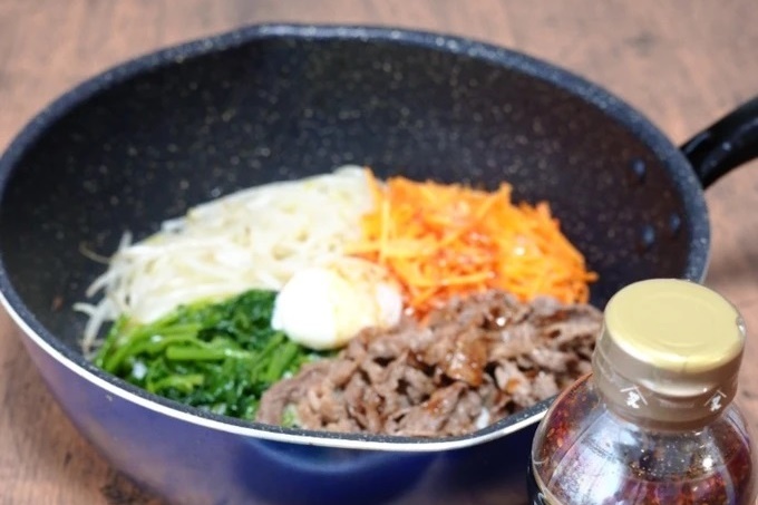 フライパンで仕上げるビビンバはお好みの焼き加減でおこげも楽しめます。