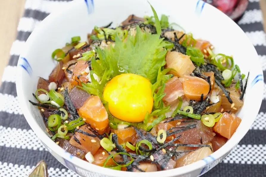 焼肉のたれをベースに作ったユッケのたれにお好みの海鮮を漬けるだけで簡単にできあがるユッケ丼です。