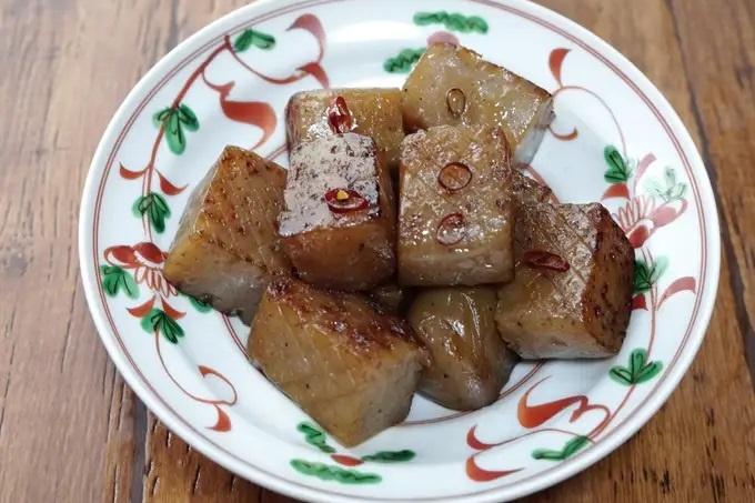 名づけられた日本の伝統的な料理の雷こんにゃくをしょうが油を使って作りました。