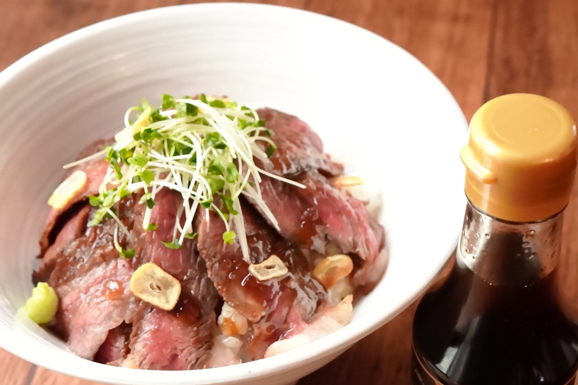 甘みのある和風ステーキソースとわさびのアクセントが効いた王道ステーキ丼です。